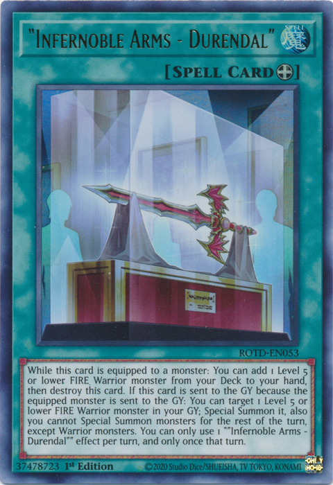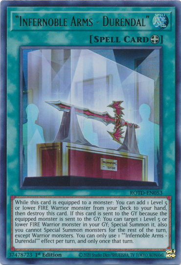 //roningames.com.au/cdn/shop/products/8f23f3f2-4ede-5af7-b480-bc98c091bee4_771x1000.png?v=1690364778"Infernoble Arms - Durendal" [ROTD-EN053] Ultra RareSet: Rise of the Duelist Card type: Equip Spell Rarity: Ultra Rare Wh... -
