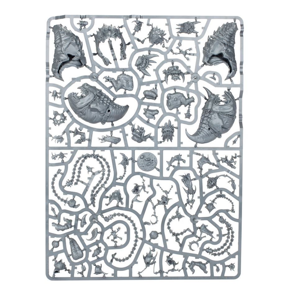 This multipart plastic kit builds one set of Mangler Squigs – a conjoined flail of fanged death. These massive monsters are a dynamic collection of drooling jaws and tangled ball-and-chains, with grot riders clinging on for dear life. This kit is packed with options for customising your Mangler Squigs – each squig comes with multiple head options and an optional faceplate, as well as a choice of rider builds and whirling chains that allow you to position your bouncing beasts differently. You'll also find basing accessories like nasty fungus and fleeing, falling grotlings.