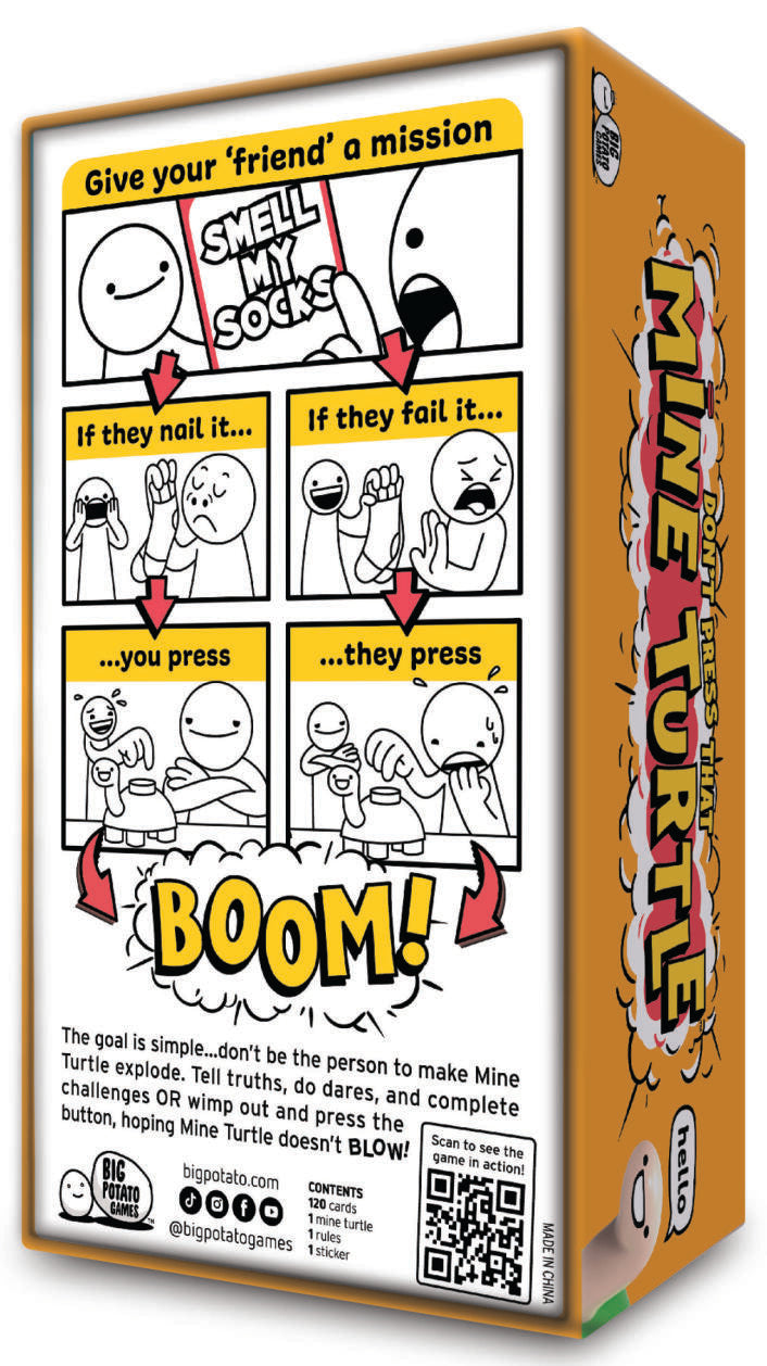 Your mission is to avoid detonating the little guy by completing challenges, doing dares and telling hard truths. The player to make Mine Turtle go BOOM! has lost the game. No one is safe in Mine Turtle. If you give a player a mission and they refuse it or fail it, they have to push the button and risk detonation. However, if you dish out a mission and they nail it, then your evil plan has backfired and YOU have to press Mine Turtle – and every press could be your last.