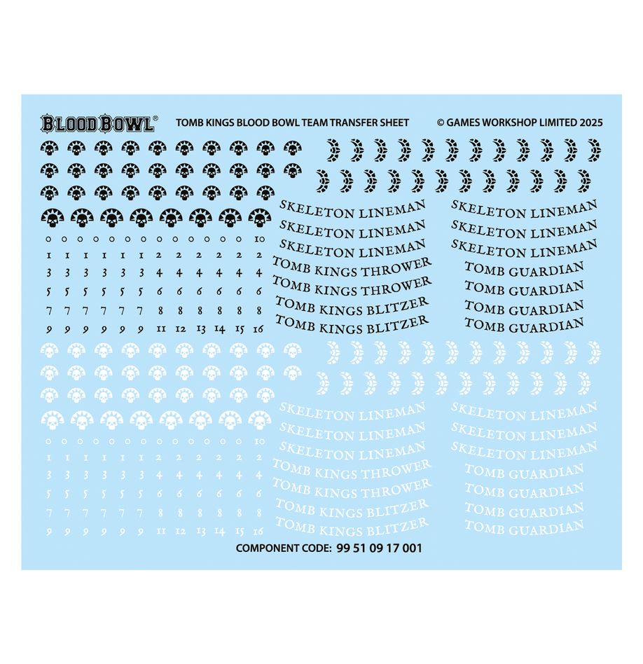 This kit is supplied with a Tomb Kings Blood Bowl Team Transfer Sheet, featuring 298 high-quality waterslide transfers. These include Tomb Kings icons, decorative elements, role identifications, and numbers for you to decorate your miniatures.