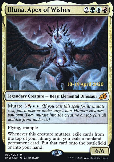 Illuna, Apex of Wishes [Ikoria: Lair of Behemoths Prerelease Promos]Set: Ikoria: Lair of Behemoths Prerelease Promos Type: Legendary Creature — Beast Elemental Dinosaur Rarity: ...