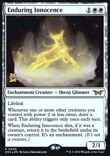 Enduring Innocence [Duskmourn: House of Horror Prerelease Promos]Set: Duskmourn: House of Horror Prerelease Promos Type: Enchantment Creature — Sheep Rarity: Rare ...