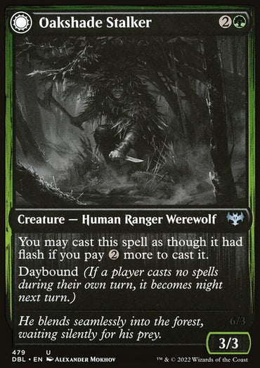 Oakshade Stalker // Moonlit Ambusher [Innistrad: Double Feature]Set: Innistrad: Double Feature Type: Creature — Human Ranger Werewolf Rarity: Uncommon ...