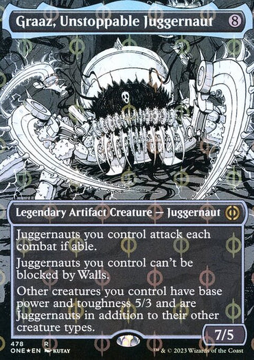 Graaz, Unstoppable Juggernaut (Borderless Manga Step-and-Compleat Foil) [Phyrexia: All Will Be One]Set: Phyrexia: All Will Be One Type: Legendary Artifact Creature — Juggernaut Rarity: Rare ...