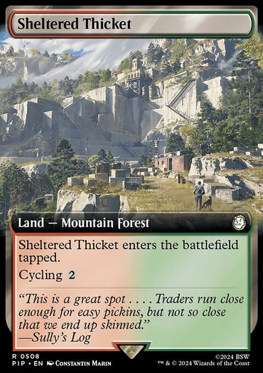 Sheltered Thicket (Extended Art) [Fallout]Set: Fallout Type: Land — Mountain Forest Rarity: Rare (T: Add R or G...