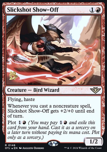 Slickshot Show-Off [Outlaws of Thunder Junction Prerelease Promos]Set: Outlaws of Thunder Junction Prerelease Promos Type: Creature — Bird Wizard Rarity: Rare ...