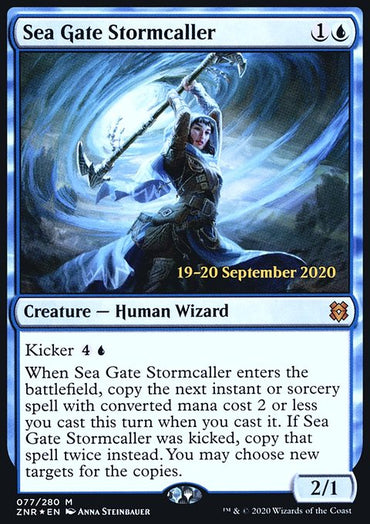 Sea Gate Stormcaller [Zendikar Rising Prerelease Promos]Set: Zendikar Rising Prerelease Promos Type: Creature — Human Wizard Rarity: Mythic ...