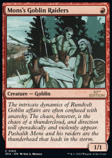 Mons's Goblin Raiders [30th Anniversary Edition]Set: 30th Anniversary Edition Type: Creature — Goblin Rarity: Common Cost: ...
