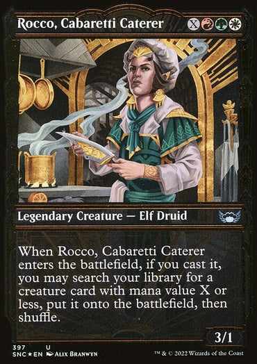 Rocco, Cabaretti Caterer (Showcase Golden Age Gilded Foil) [Streets of New Capenna]Set: Streets of New Capenna Type: Legendary Creature — Elf Druid Rarity: Uncommon ...