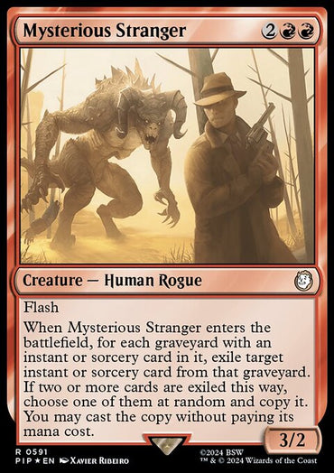 Mysterious Stranger (Surge Foil) [Fallout]Set: Fallout Type: Creature — Human Rogue Rarity: Rare Cost: {2}{R...
