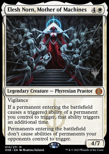Elesh Norn, Mother of Machines (Promo Pack) [Phyrexia: All Will Be One Promos]Set: Phyrexia: All Will Be One Promos Type: Legendary Creature — Phyrexian Praetor Rarity: Mythic ...