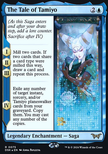 The Tale of Tamiyo [Duskmourn: House of Horror Prerelease Promos]Set: Duskmourn: House of Horror Prerelease Promos Type: Legendary Enchantment — Saga Rarity: Rare Cost: {2}{U} (As this Saga enters and after your draw step, add a lore counter. Sacrif...