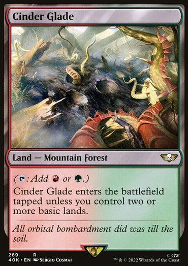 Cinder Glade (Surge Foil) [Warhammer 40,000]Set: Warhammer 40,000 Type: Land — Mountain Forest Rarity: Rare ({T}:...
