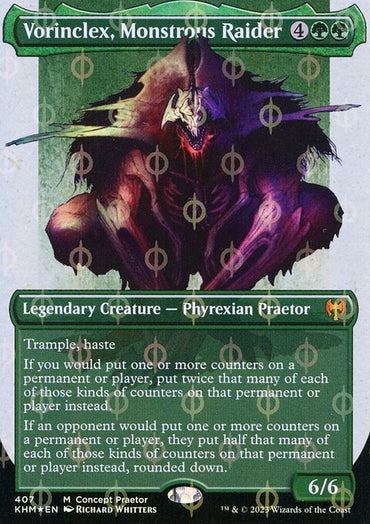 Vorinclex, Monstrous Raider (Borderless Concept Praetors Step-and-Compleat Foil) [Phyrexia: All Will Be One]Set: Phyrexia: All Will Be One Type: Legendary Creature — Phyrexian Praetor Rarity: Mythic ...