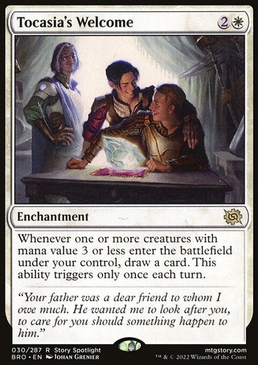 Tocasia's Welcome [The Brothers' War]Set: The Brothers' War Type: Enchantment Rarity: Rare Cost: {2}{W}...