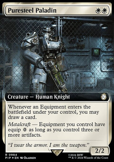 Puresteel Paladin (Extended Art) (Surge Foil) [Fallout]Set: Fallout Type: Creature — Human Knight Rarity: Rare Cost: {W}{...