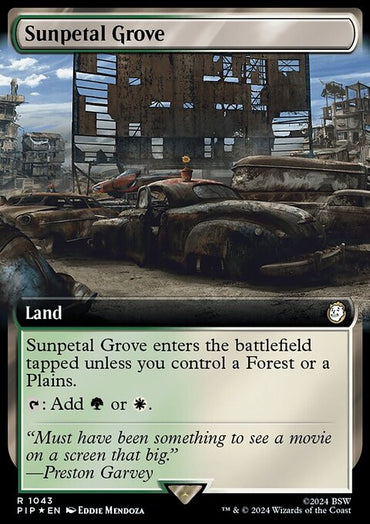 Sunpetal Grove (Extended Art) (Surge Foil) [Fallout]Set: Fallout Type: Land Rarity: Rare Sunpetal Grove enters the battle...