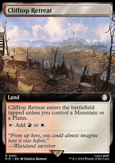 Clifftop Retreat (Extended Art) [Fallout]Set: Fallout Type: Land Rarity: Rare Clifftop Retreat enters the batt...