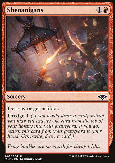 Shenanigans [Modern Horizons]Set: Modern Horizons Type: Sorcery Rarity: Common Cost: {1}{R} Destroy target artifact.Dredge 1 (If you would draw a card, you may mill a card instead. If you do, return this card from...