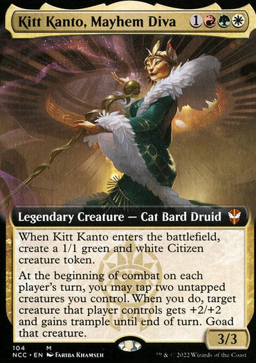 Kitt Kanto, Mayhem Diva [Streets of New Capenna Commander]Set: Streets of New Capenna Commander Type: Legendary Creature — Cat Bard Druid Rarity: Mythic ...
