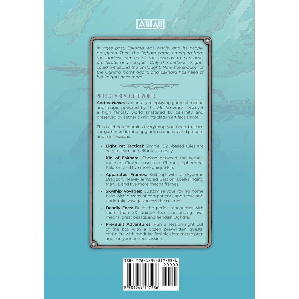 Discover a high fantasy world shattered by calamity and preserved by aetheric knights clad in artifact armor. Inspired by such properties as The Vision of Escaflowne, Nausicaä of the Valley of Wind, and Aura Battler Dunbine, Aether Nexus features a full ruleset, unique player options for customizing aetheric knights and their Apparatus, and a host of Game Master tools to help build harrowing adventures across an exciting fantasy setting.