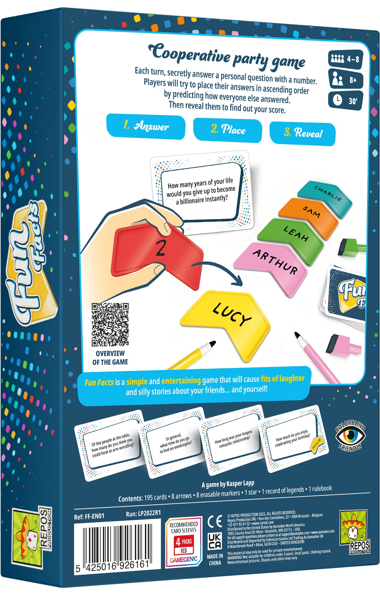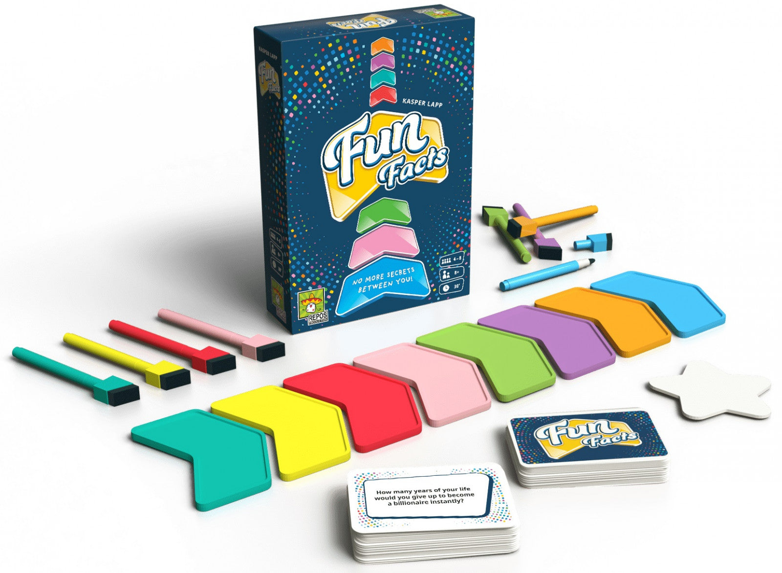 Each round in Fun Facts, a question is placed in the center of the table, e.g., "How long is the perfect nap?", then everyone secretly writes their answer on their colored arrow and places that arrow face down on the table. (You write your name on the other side of the arrow so that everyone knows which arrow is whose.)