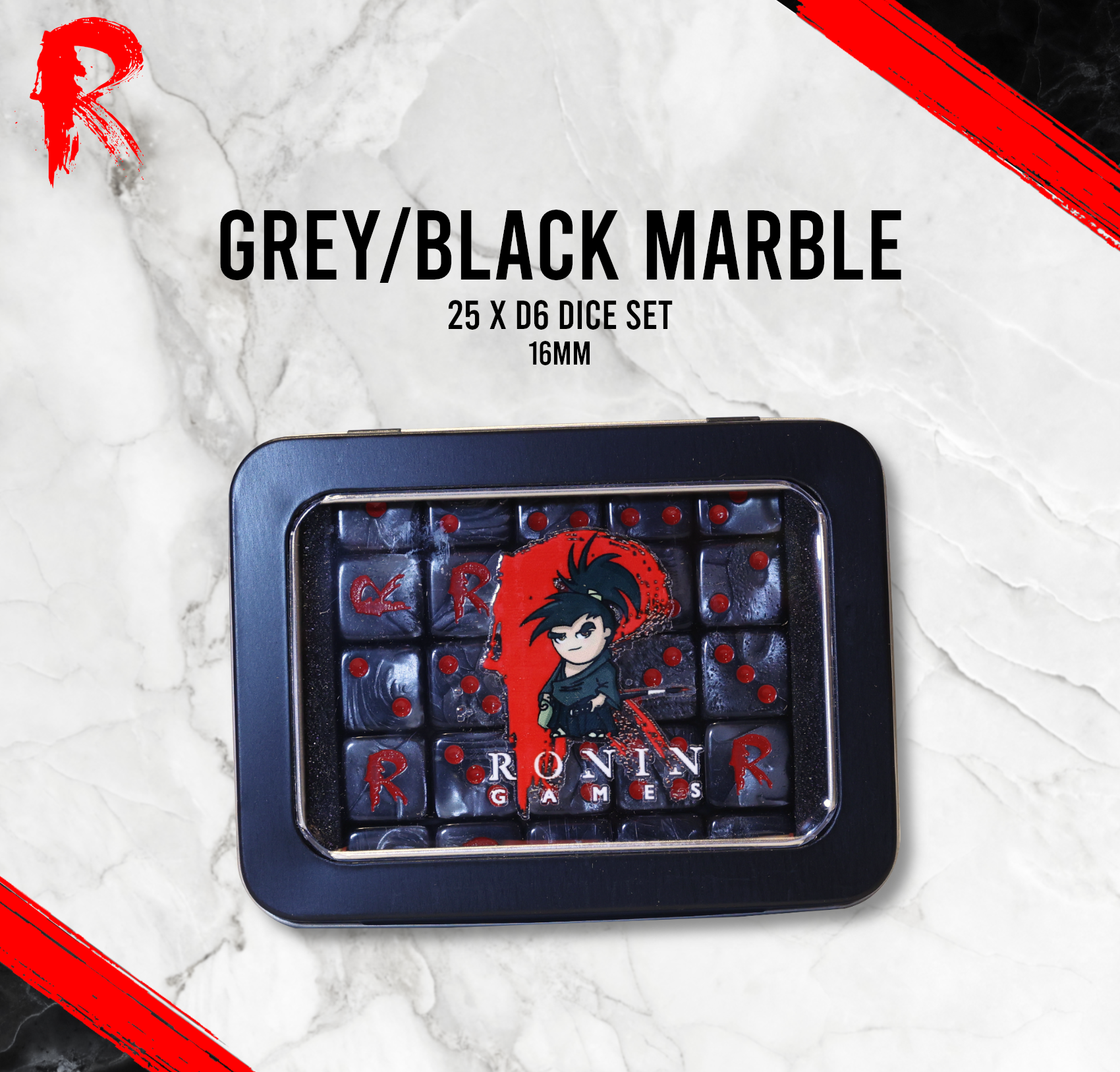 Elevate your gaming experience with the Ronin Grey/Black Marble 25-piece D6 Dice Set. Each 16mm die features a refined grey and black marble pattern, offering both elegance and durability. Ideal for a variety of tabletop games, this set combines style with practicality, ensuring every roll is as striking as it is precise. Perfect for collectors and serious gamers alike.
