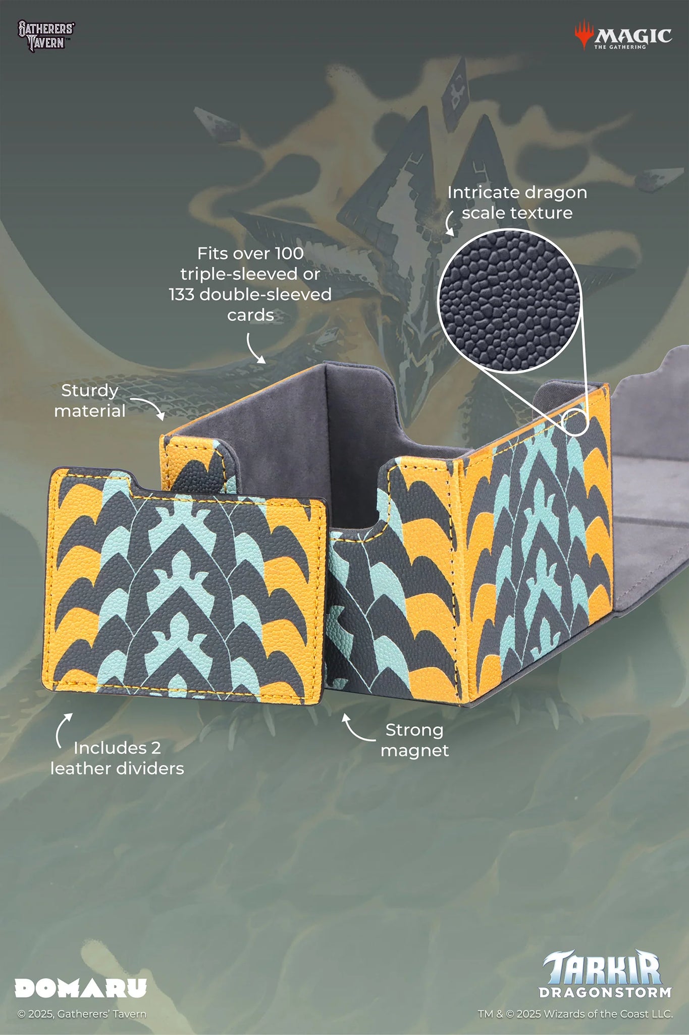 Choose your spirit dragon with these Tarkir: Dragonstorm DOMARU boxes, featuring textured scale patterns inspired by the five dragons. Your cards and other items will be kept safe under their protection.