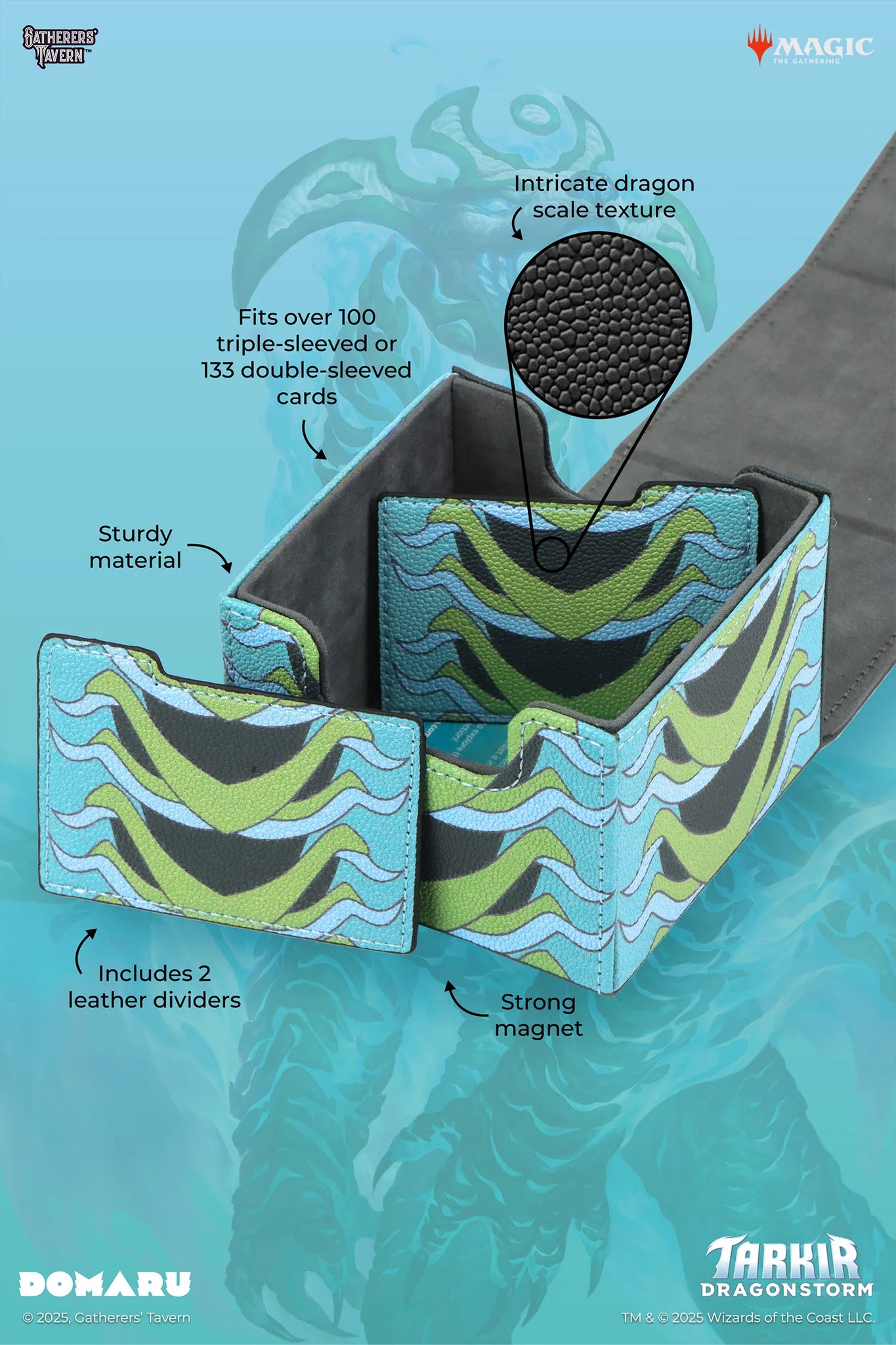 Choose your spirit dragon with these Tarkir: Dragonstorm DOMARU boxes, featuring textured scale patterns inspired by the five dragons. Your cards and other items will be kept safe under their protection.