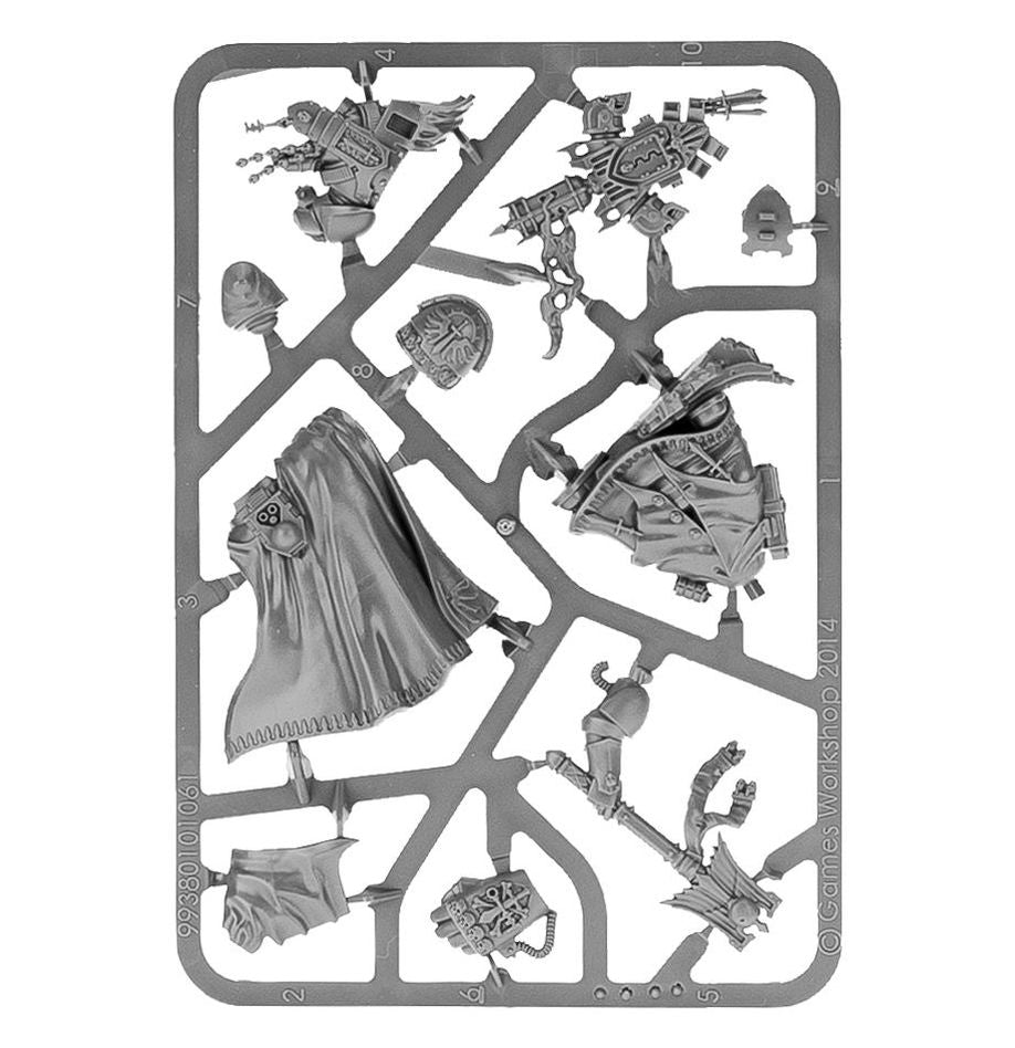 This multi-part, ten-component plastic kit contains everything needed to make one Dark Angels Interrogator-Chaplain, complete with Crozius Arcanum and Power Fist.