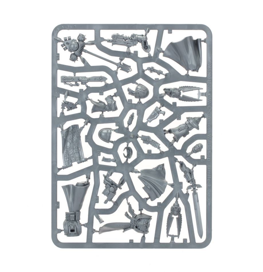 This multipart plastic kit builds Azrael, Chapter Master of the Dark Angels. This respected leader has crossed the Rubicon Primaris and now wears Mk X Tacticus armour, draped in robes and adorned with the symbols of his Chapter. Azrael raises the Sword of Secrets in one hand, while the other holds the Lion's Wrath – an ancient combi-plasma weapon of fabled power. Beside him walks a Watcher in the Dark, one of the mysterious robed guardians of The Rock, which can be assembled carrying either an ornate scabbard or the Lion Helm – a sacred relic worn by Lion El'Jonson himself. Azrael himself can be built wearing the Lion Helm, or with a bare head.