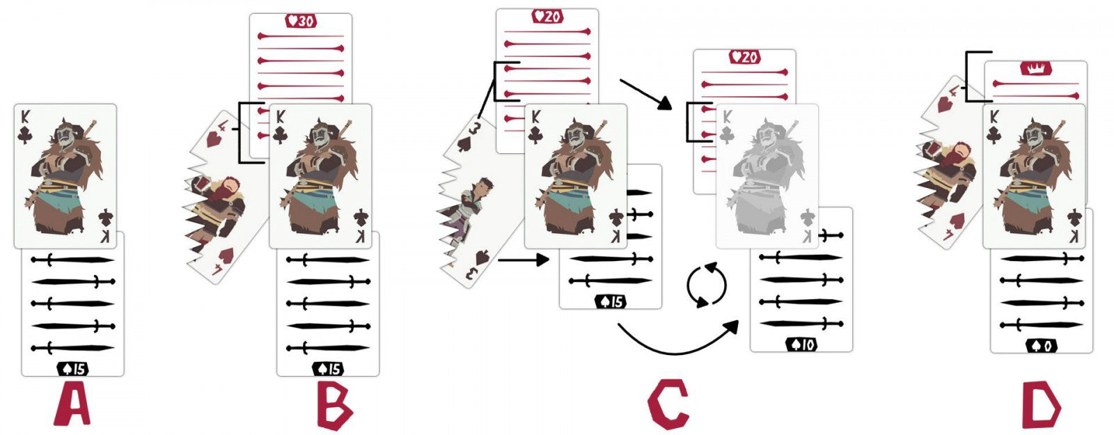 Players work together to defeat 12 powerful enemies. On their turn a player plays a card to the table to attack the enemy and once enough damage is dealt, the enemy is defeated. The players win when the last King is defeated. But beware! Each turn the enemy strikes back. Players will discard cards to satisfy the damage and if they can't discard enough, everyone loses.